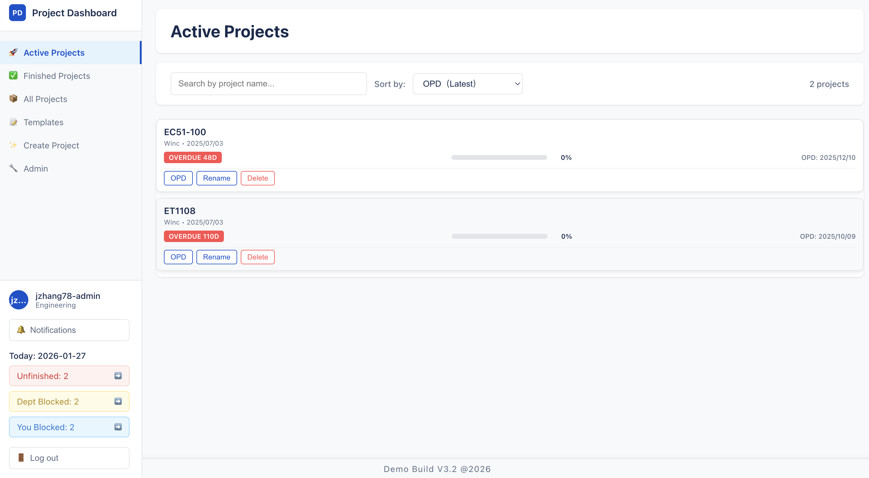 Project Dashboard is an enterprise-grade workflow management system designed to visualize and track business processes from sales to warehouse operations. Developed for a UK-based mechanical manufacturing company, the system enables cross-departmental collaboration, improves operational efficiency, and prevents task omissions through automated workflow progression and real-time tracking.